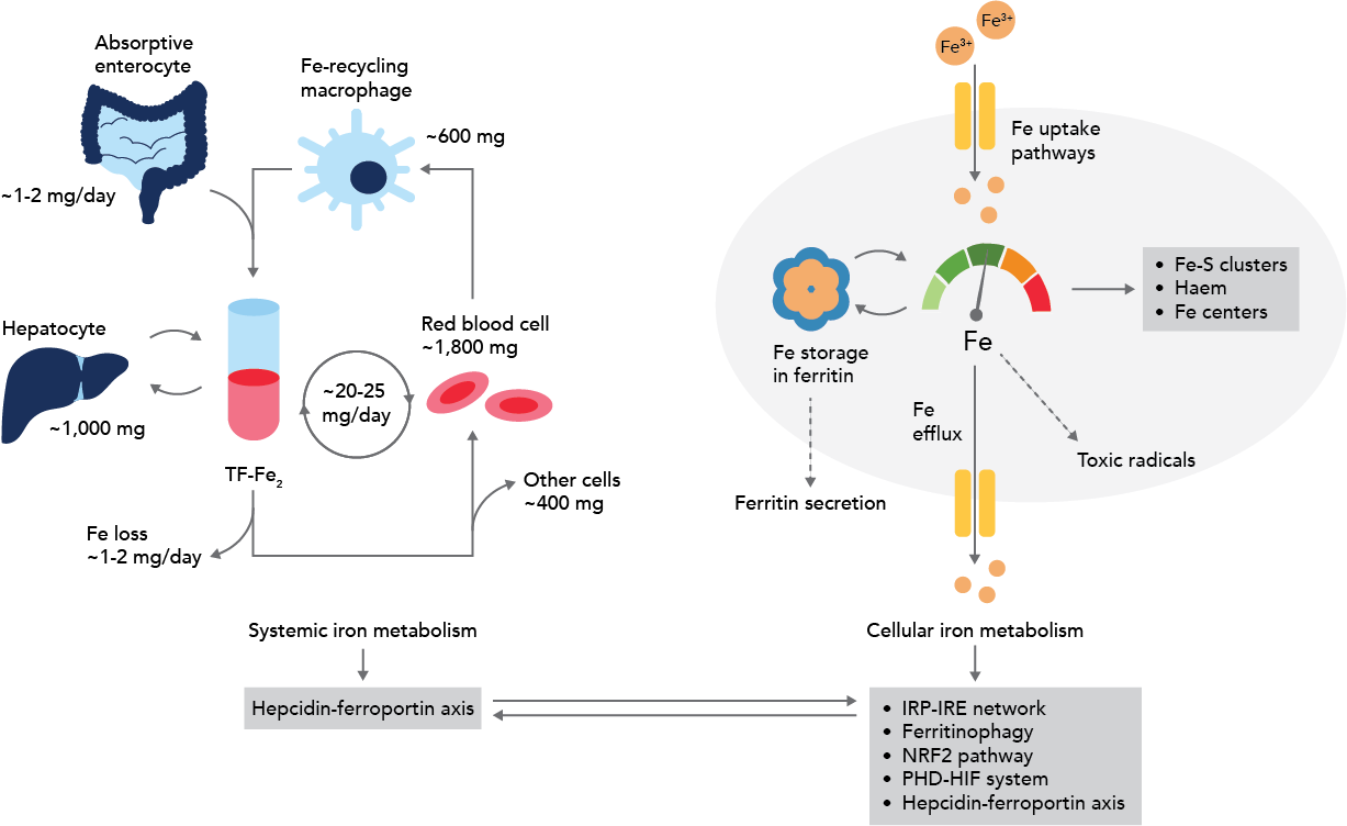 Iron is necessary for many biological processes. A lack of iron can cause anemia, resulting in a deficiency of healthy red blood cells or hemoglobin necessary to carry oxygen to the body’s tissues. This can cause health problems, especially in children, by affecting their immune systems3. However, too much iron can also be dangerous through the generation of reactive oxygen species (ROS)4 which can cause cell damage and trigger inflammation.