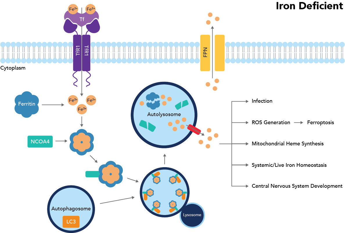Autophagy was first implicated in iron homeostasis in 2011, when Asano et. al discovered ferritin was targeted for degradation in the lysosome via a mechanism that involved autophagy in cells lacking sufficient iron5. Since then, the role of autophagy in ferritin degradation has been confirmed through autophagy deletion models where ferritin clusters build up in cells6. Researchers have also identified that the protein nuclear receptor co-activator 4 (NCOA4) helps guide ferritin to the lysosome for breakdown7,8. This specific type of autophagy has been named ferritinophagy. If it doesn’t work properly and excessive intracellular iron accumulates, it can lead to ferroptosis, a type of controlled cell death caused by excess iron.