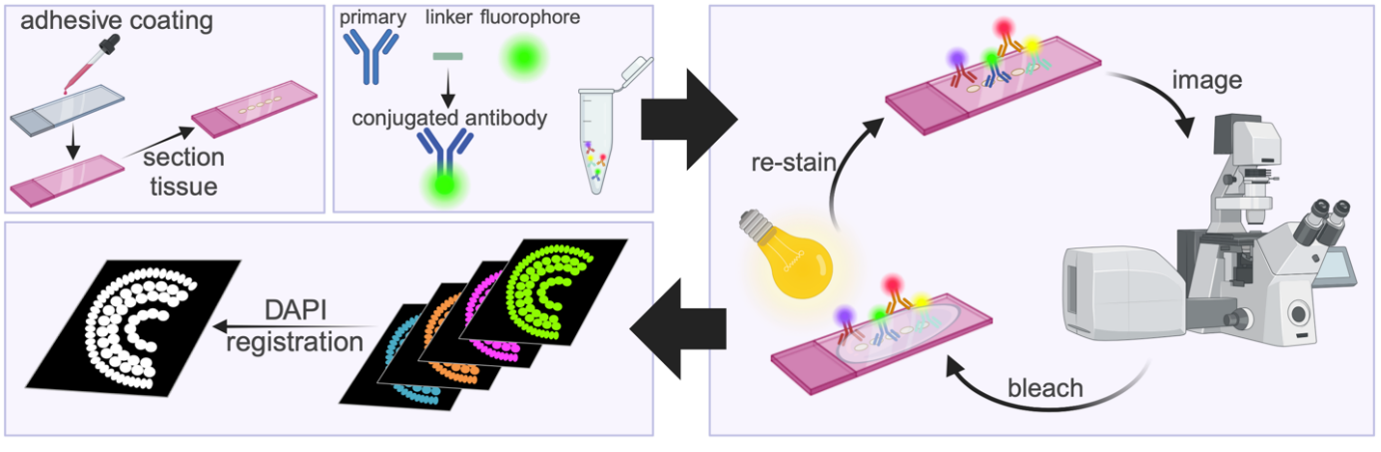 Figure 4. Schematic of the IBEX method. Slides are coated with chrome alum gelatin to prevent tissue loss, then tissue sectioned onto slides. Antibodies are micro-conjugated by mixing the primary antibody with a linker and fluorophore. The antibodies are applied to the slide, incubated, imaged, then bleached using bright light and lithium borohydride before being re-stained. After the imaging rounds are completed, nuclear stains (DAPI) are used to register the image, allowing for all stains to be visualized together. Made with Biorender. (Kothurkar et al., 2024)