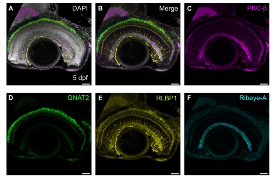 Figure 3. Four different antibodies, each raised in rabbit, can be visualized on the same piece of tissue using FlexAble micro-conjugation. Epifluorescence image of sagittal section of 5 days post fertilization (dpf) retina, immunolabeled with PKC-ß (magenta, bipolar cells), GNAT2 (green, cones), RLBP1 (yellow, Müller glia), Ribeye-A (cyan, ribbon synapses). Scale bars - 25µm. Image from Kothurkar et al. 2024.