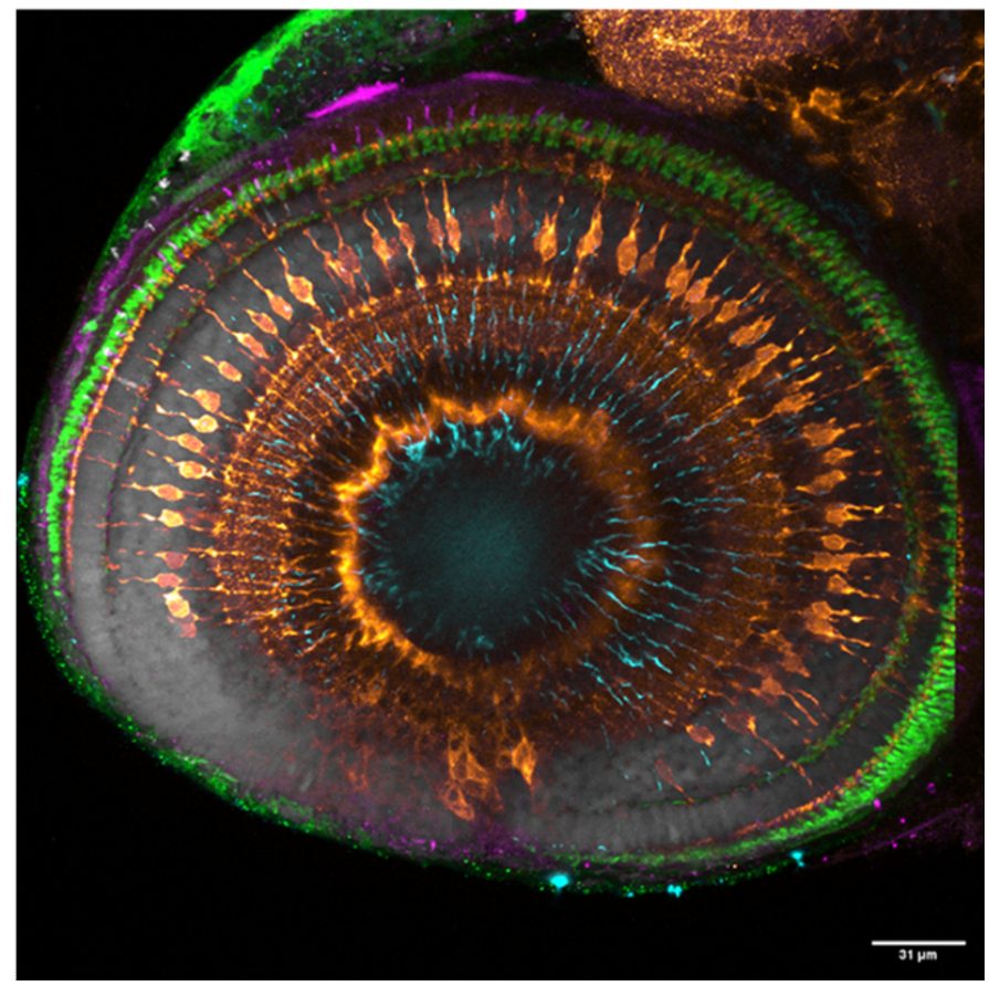 Figure 7: Merge of wholemount confocal images of immunolabeling to detect Zrf-1 (cyan), GNAT2 (green), GS (orange), and blue opsin (magenta) with DAPI (grey). Scale bars - 25µm (Kothurkar et al., 2024).