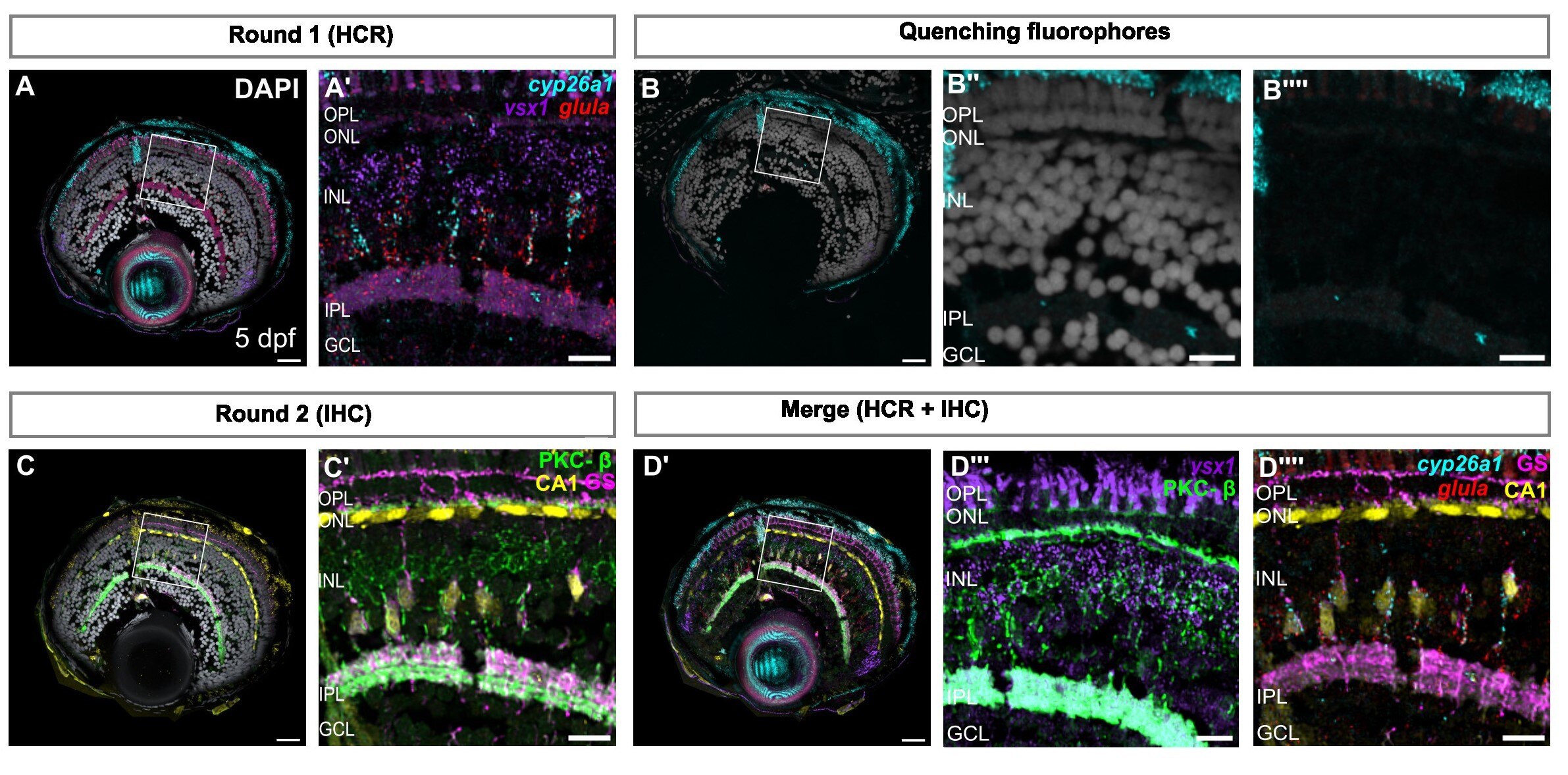 Figure 6. (A) Confocal images of retinal sections showing mRNA expression of cyp26a1, glula, and vsx1, using in situ hybridization chain reaction (HCR). (A′) Zoom on the region of interest indicated in (A). (B-B′′′’) Confocal images showing reduced signal of AlexaFluor-488, 555, & 647, after heating in sodium citrate at 60ºC. (C) Confocal images of retinal sections immunolabeled with CA1 (yellow), PKC-β (green), and GS (magenta). (C′) Zoom on region of interest indicated in (C). (D) SimpleITK registered image, showing overlay of both rounds of imaging and overlay of in situ probes and antibodies detecting Müller glia and bipolar cells, respectively. (D′′-D′′′) Zoom of region of interest shown in (D, D′). Scale bars - 25µm for whole retina, 10µm for zoom images (Kothurkar et al., 2024).