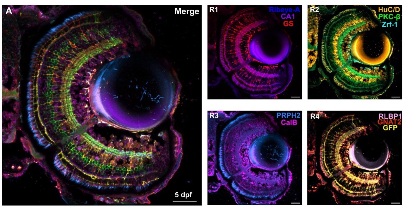 Figure 5. IBEX enables simultaneous labeling of all retinal cell types. (A) Merge of confocal images showing a single sagittal retinal section immunolabeled with 11 different markers: Ribeye-A (dark blue), carbonic anhydrase (CA1, purple), glutamine synthetase (GS, red), PKC-β (green), Zrf-1 (cyan), HuC/D (orange), GFP transgene (yellow), calbindin (CalB, magenta), peripherin-2 (PRPH2, light blue), GNAT2 (orange), and RLBP1 (pink) and the merge separated into different rounds of staining. Scale bars - 25µm (Kothurkar et al., 2024).