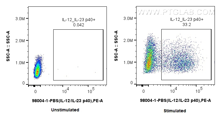 98004-1-PBS targets IL-12/IL-23 p40 in FC (Intra) applications and shows reactivity with mouse samples.