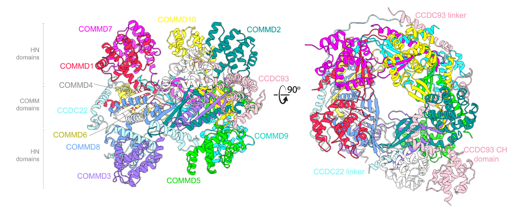 Cryo-EM structural analysis revealed the human COMMD proteins assemble into a distinct hetero-decameric closed ring. The ring is comprised of five heterodimers connected in precise order ((COMMD1-6)-(COMMD4-8)-(COMMD2-3)-(COMMD10-5)-(COMMD7-9)). The COMMD proteins assemble into something analogous to a ‘bagel’ (unofficial term). The COMM domains resemble the filling of the bagel. The a-helical N-terminal (HN) domains decorate the upper and lower surfaces of the structure, like the slices of bread (Figure 5).