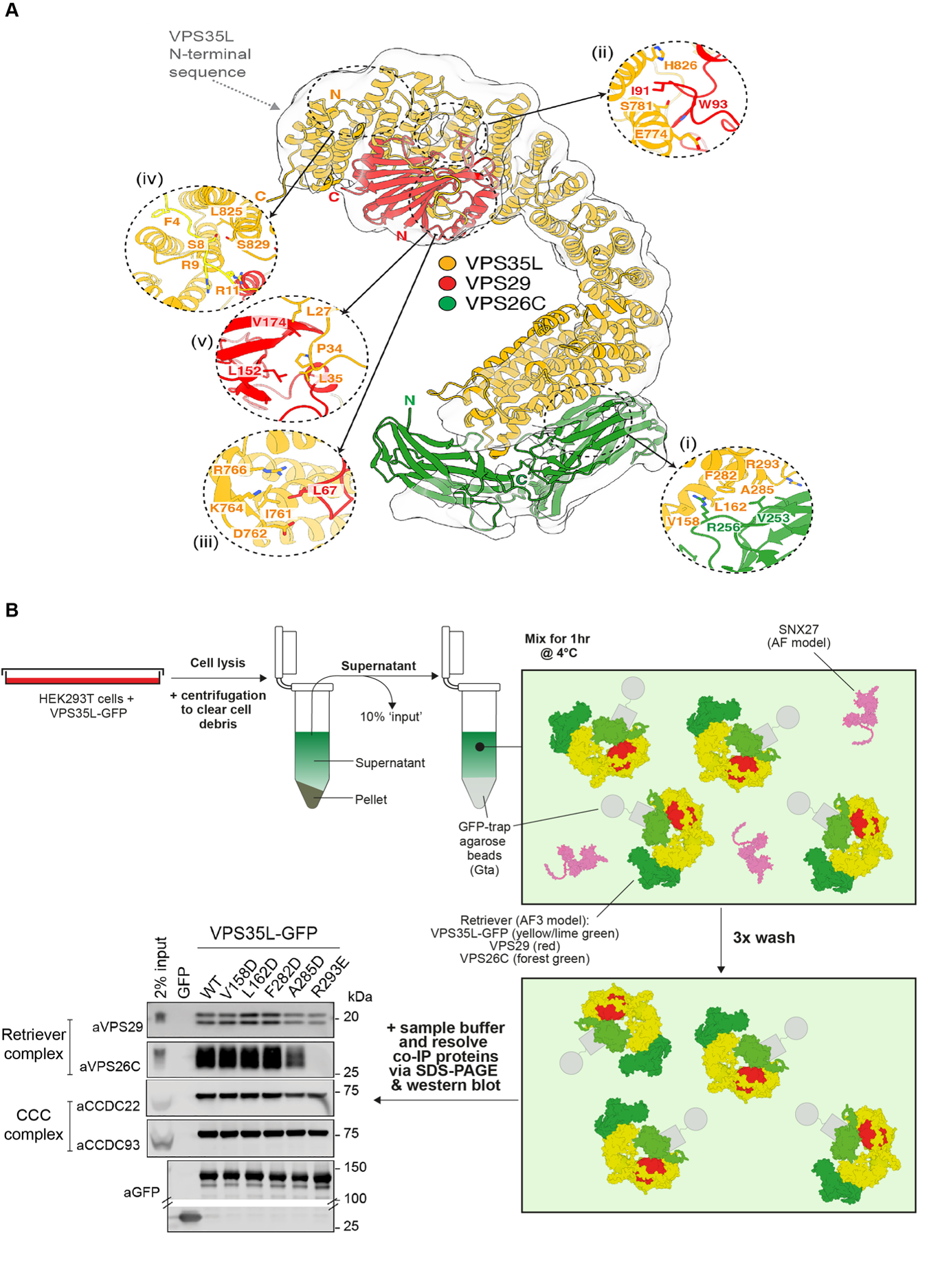 Figure 4. Retriever AlphaFold2 model is validated by structure-based mutagenesis. (A) Retriever is a heterotrimer of VPS26C (green):VPS35L (yellow):VPS29 (red). High confidence AlphaFold2 model superimposed on low-resolution 3D cryo-EM envelope. Key heterotrimer binding interfaces are highlighted (i-v) (article figure 1B). (B) GFP-nanotrap immunoprecipitation allowed authors to pick apart Retriever binding interface. HEK293T cells transiently transfected with VPS35L-GFP. Cells lysed and VPS35L-GFP enriched via immunoprecipitation. SNX27 model taken from AlphaFold database (UniProt Accession: Q96L92). Retriever model , including VPS35L-GFP, modeled using AF3. Interactors are probed for via western blotting. VPS35L and VPS26C binding interface validated via GFP-nanotrap immunoprecipitation (western blot taken from article). Proteintech aCCDC22 (16636-1-AP) and aCCDC93 (20861-1-AP) used to test VPS35L mutant impact on Retriever-CCC complex binding (adapted from article figure 1C). AF, AlphaFold; AF3, AlphaFold3; SNX27, sorting nexin-27.