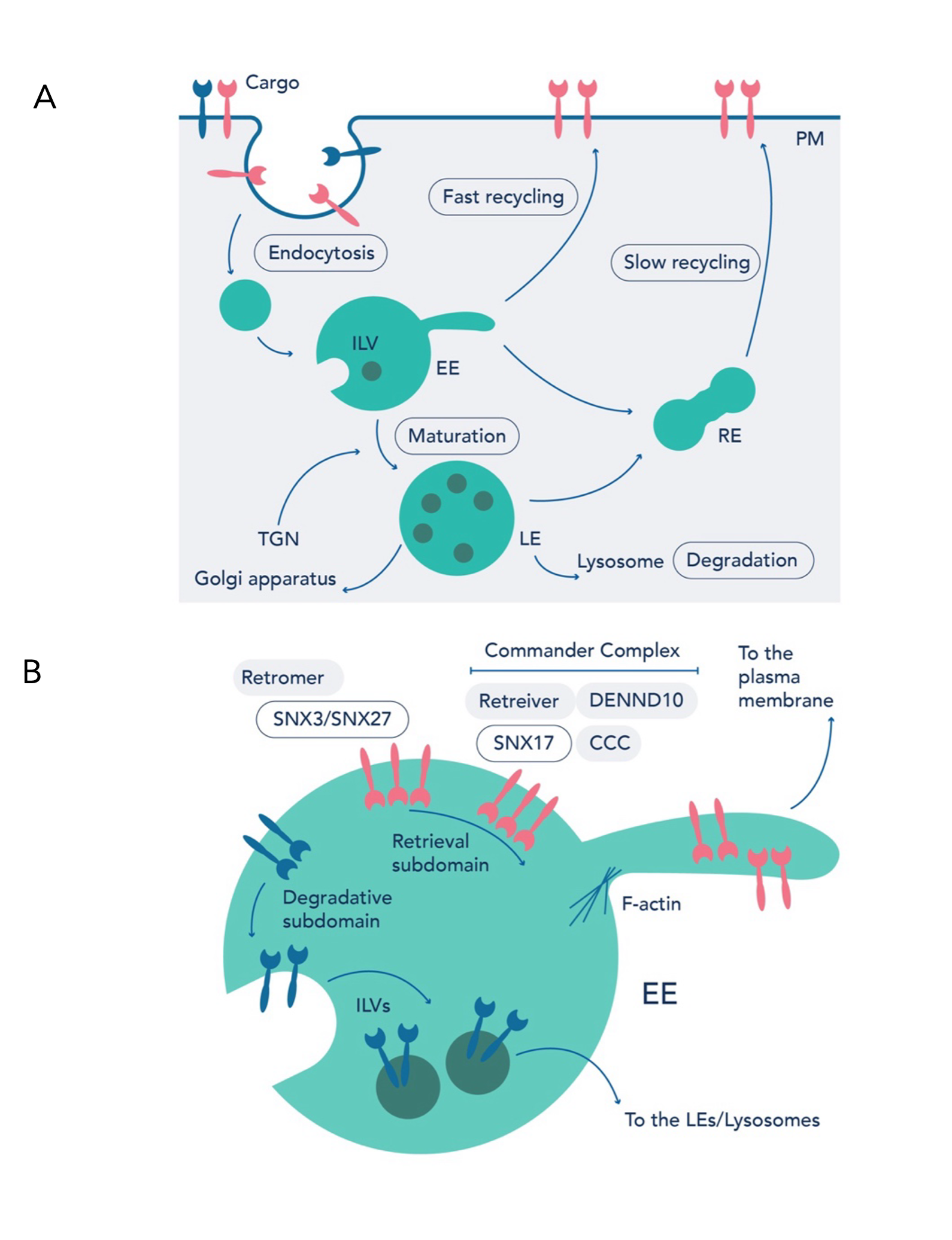 Figure 2. The endolysosomal network. (A) Transmembrane proteins (termed ‘cargo’) are delivered to the cell surface via the secretory pathway. Nascently internalized cargo from the cell surface enter endocytic vesicles. These endocytic vesicles fuse to form EEs. EEs mature through the endolysosomal network to LEs and finally lysosomes for degradation. Cargo destined for degradation are packaged into ILVs. Alternatively, cargo can be returned to the PM or TGN, preventing degradation in the lysosome. (B) Endosomal sorting machinery recruit cargo to the retrieval subdomain. Cargo adaptors, such as (SNX3)/ SNX27 or SNX17, work in tandem with Retromer or Commander, respectively, to enrich cargo. These machinery couple sequence dependent cargo recognition and membrane remodeling to package cargo into tubulovesicular carriers for endosome exit. CCC, COMMD/CCDC22/CCDC93; DENND10, Differentially expressed in normal and neoplastic cells-containing protein 10; EEs, early endosomes; ILVs, intra-luminal vesicles; LEs, late endosomes; PM, plasma membrane; SNX, sorting nexin; TGN, trans-Golgi network.