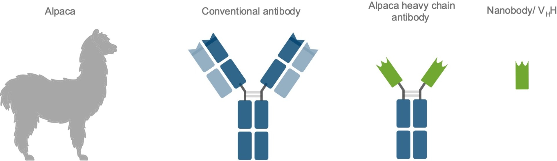 Camelids such as dromedaries, llamas, and alpacas possess an immune repertoire of three subclass IgG antibodies: IgG1, IgG2, and IgG3. IgG1 is a conventional IgG composed of two heavy chains and two light chains. IgG2 and IgG3 are heavy chain only IgGs antibodies (HCAbs) that can be distinguished by their hinge regions. These HCAbs lack the CH1 domain of the heavy chain and are devoid of any light chain. The antigen binding domain of a heavy chain only IgG is called VHH or Nanobody. VHHs have several general advantages; ChromoTek’s Nanobodies and Nanobody-based research tools, however, have even more advantages: their high level of performance, characterization, and validation.